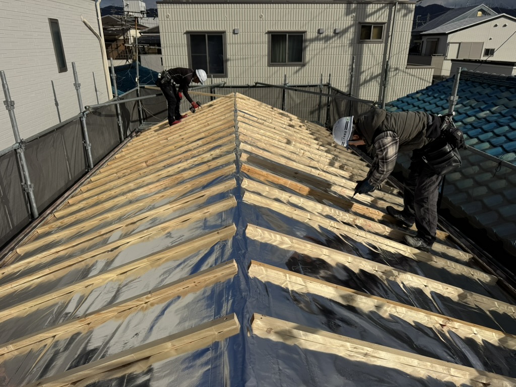 - 瓦屋根を撤去後、遮熱アルミ材を貼り、ガルバリウム鋼板を仕上げでカバー。